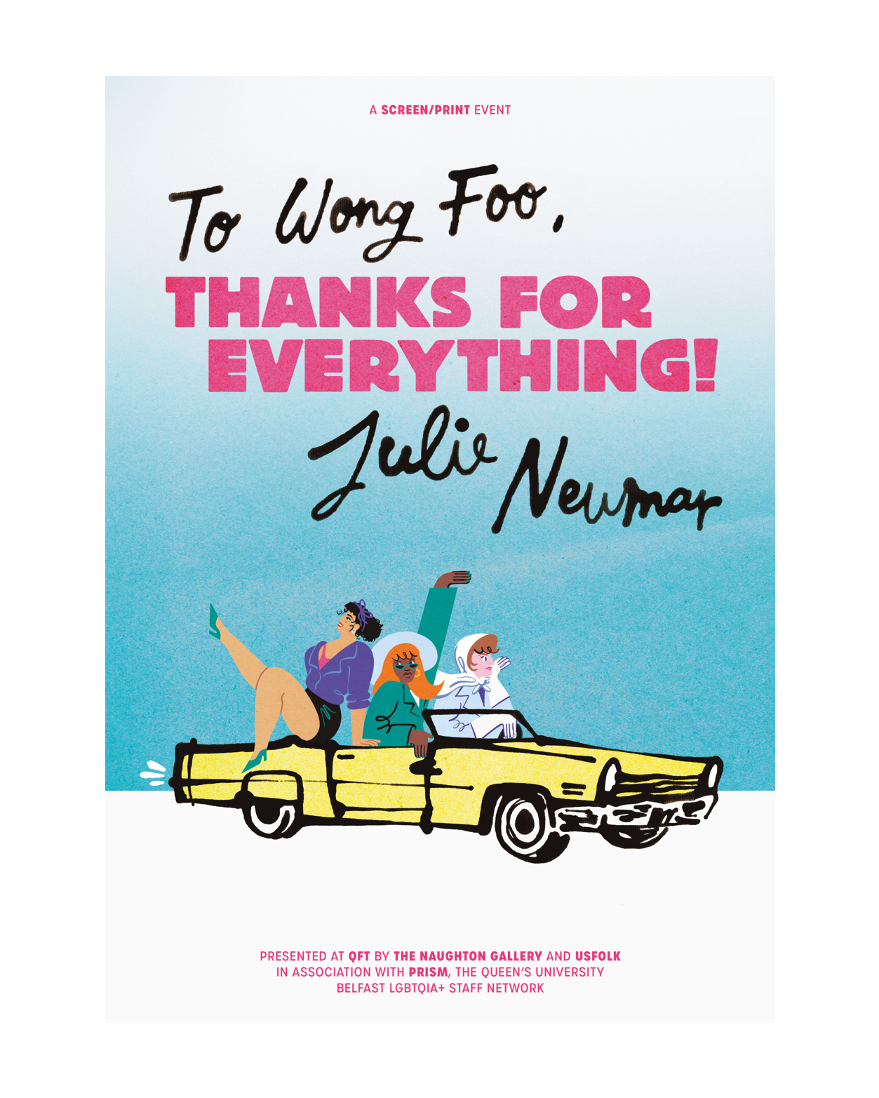 Poster for the 1995 film ‘To Wong Foo, Thanks For Everything! Julie Newmar’. Commissioned by UsFolk illustration agency as part of their project SCREEN/PRINT, in collaboration with the Naughton Gallery and Queen’s Film Theatre.
